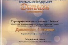 Хореографический коллектив "Лейсан" стала дипломантом I степени в международном конкурсе "Хрустальное сердце мира" в номинации "Хореография". ( руководитель Хакимова Л.Ф.)