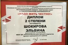 Обучающуюся в кружке"Дизайн и ИЗО" Шокирова Эльвина (рук.Галиева Р.А.) заняла 2 место на республиканском конкурсе творческих работ антикоррупционной направленности "Надо жить честно!" .