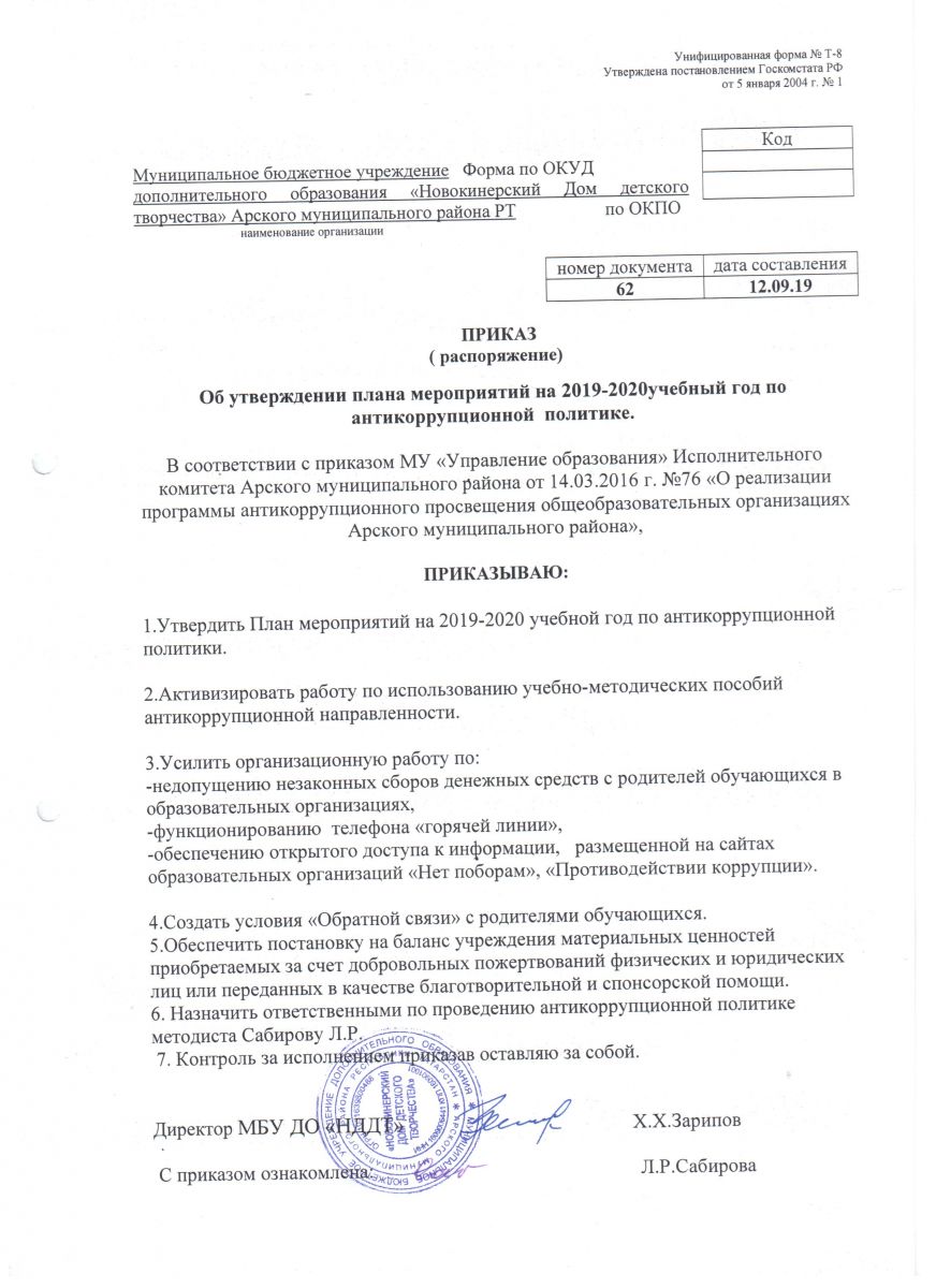 Приказ об утверждении плана мероприятий на 2019-2020 уч.год