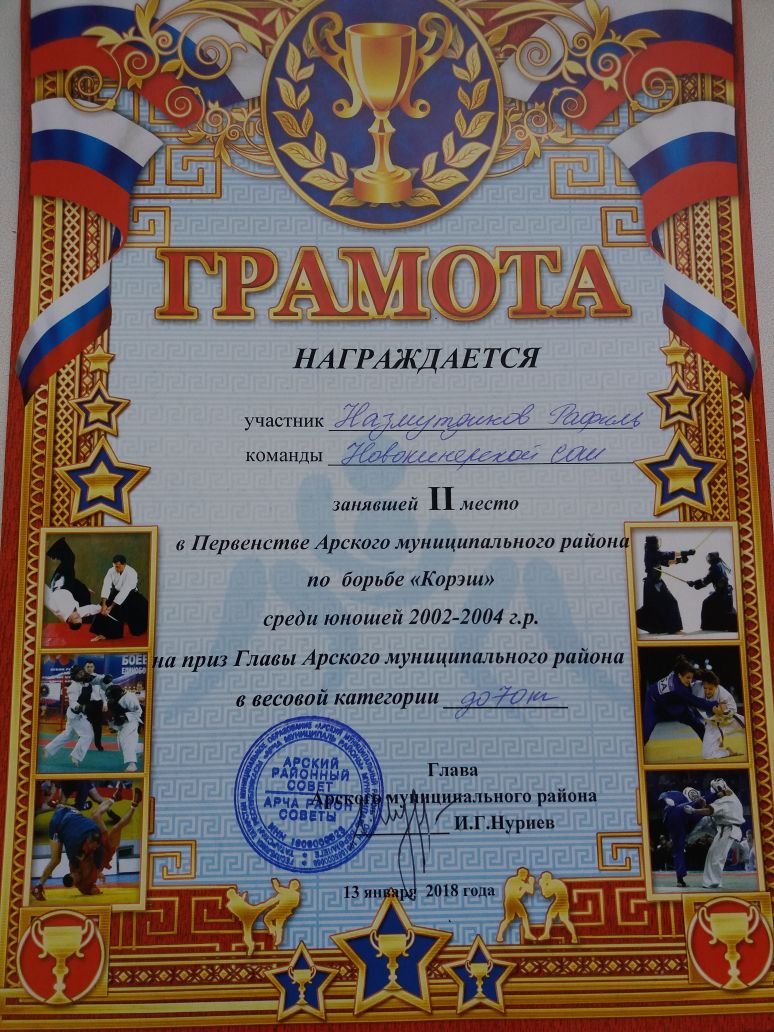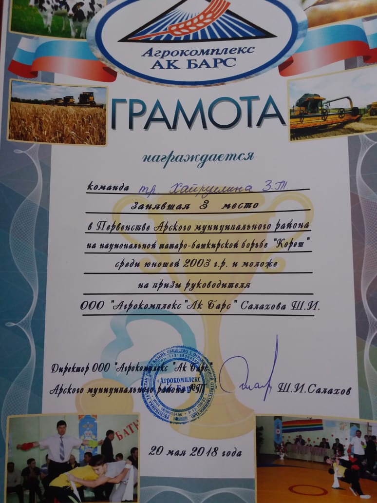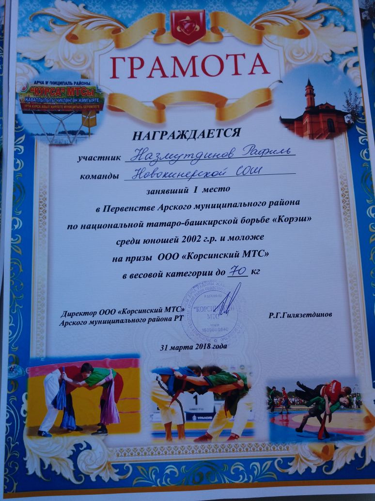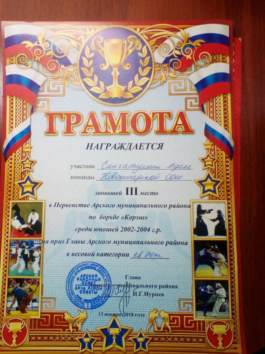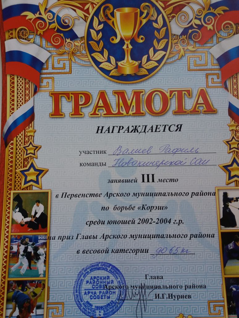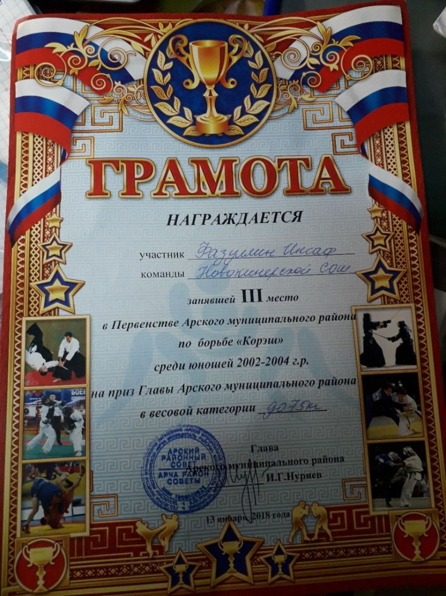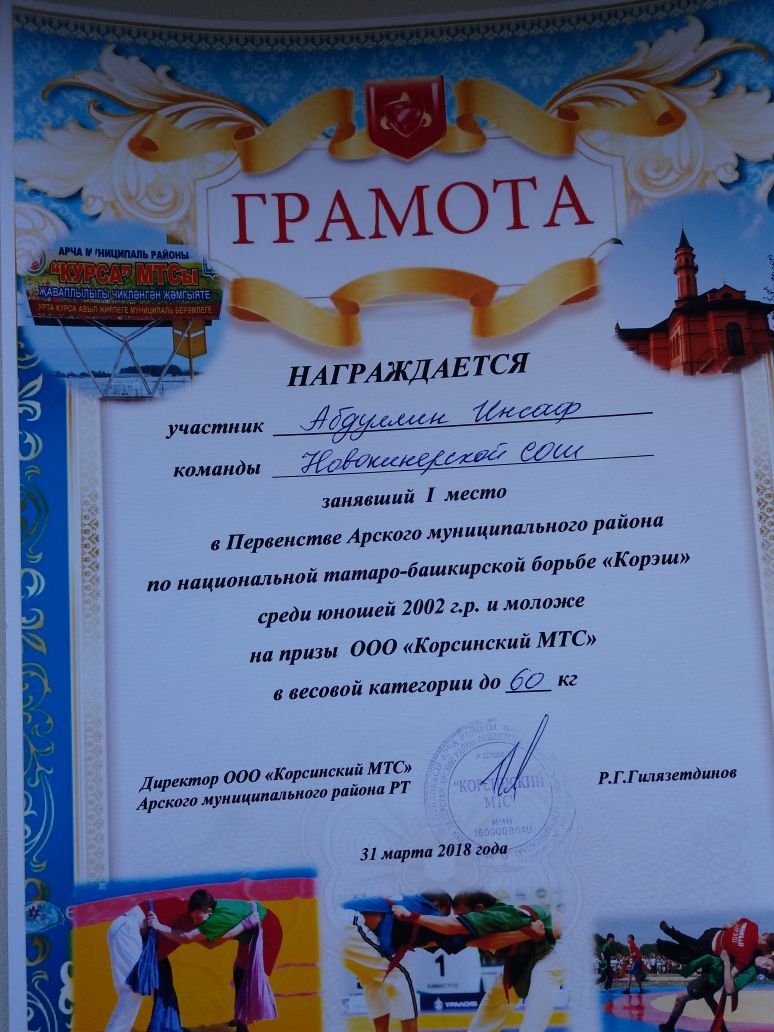 1 место в Первенстве Арского муниципального района по борьбе "Көрәш"