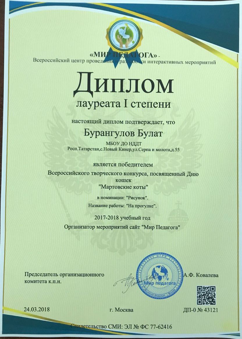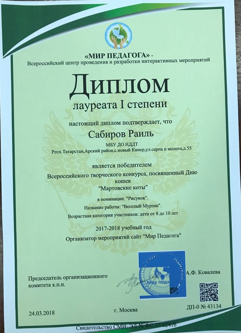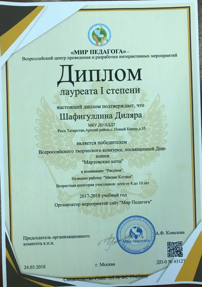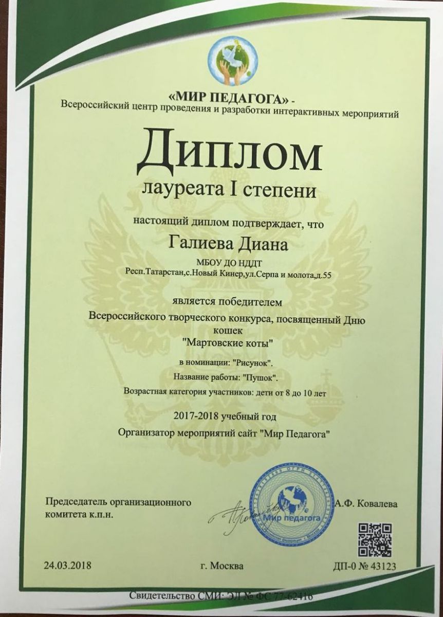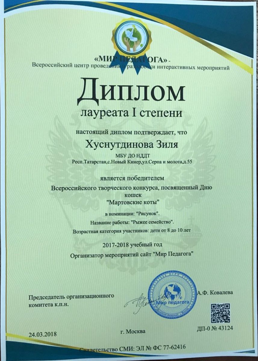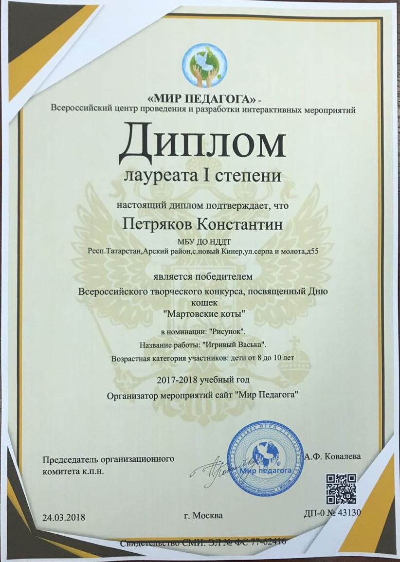 Лауреат 1 степени всероссийского творческого конкурса "Мартовские коты"