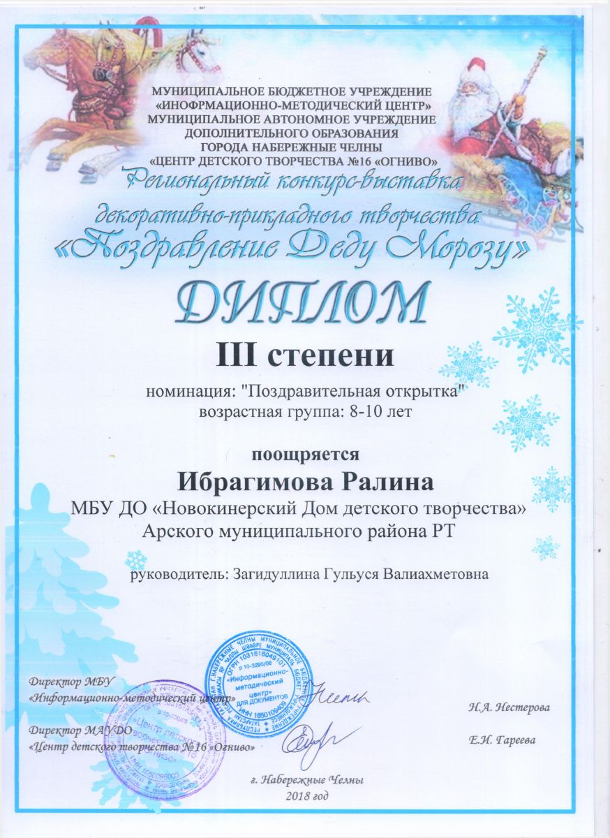 Диплом 3 степени регионального конкурса "Поздравление Деду Морозу"