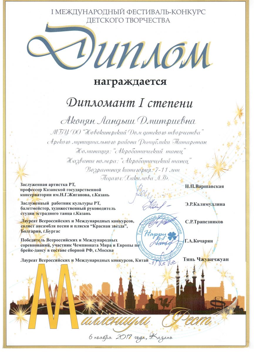 Диплом 1 степени на Международном фестивале-конкурсе "Миллениум Фест"