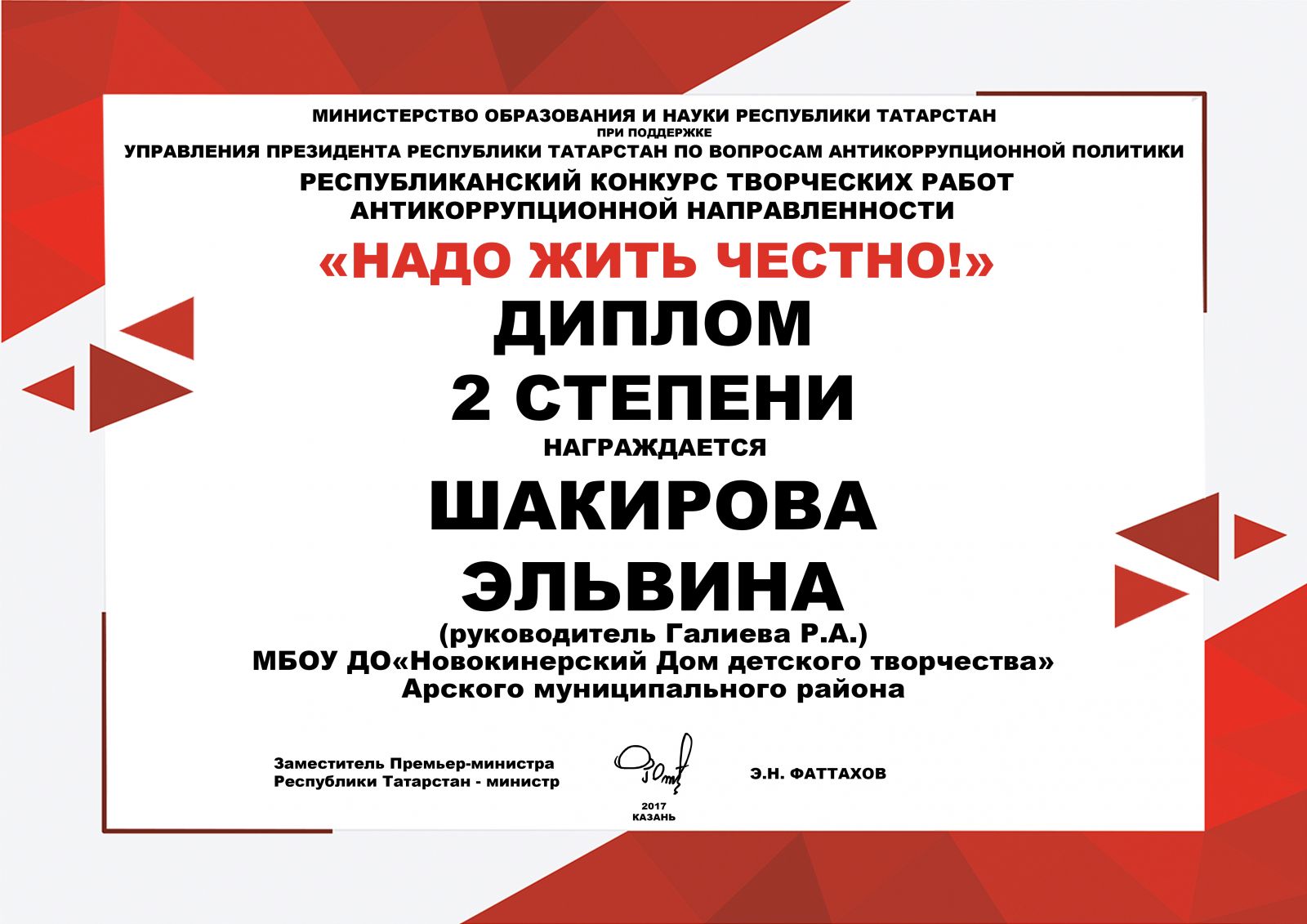 Диплом 2 степени республиканского конкурса "Надо жить честно"