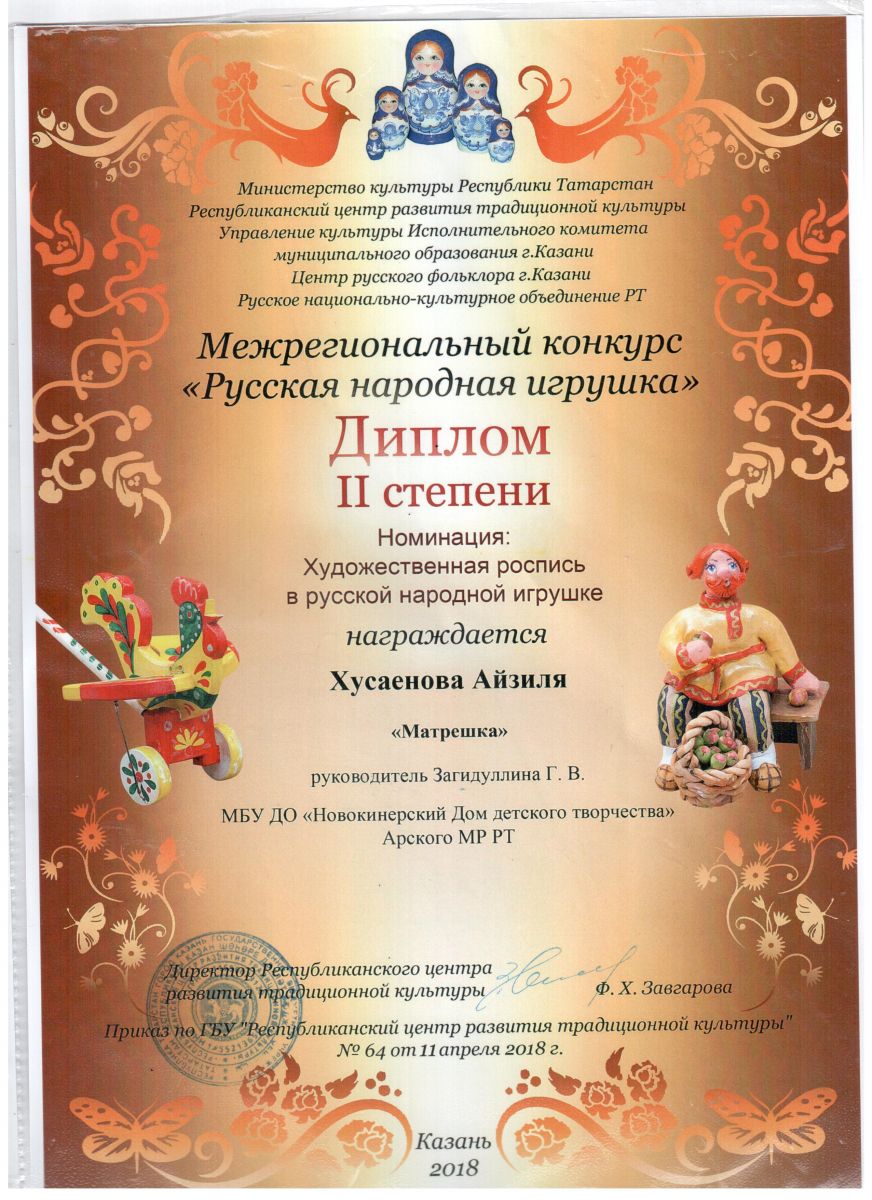 Диплом 2 степени межрегионального конкурса "Русская народная игрушка"