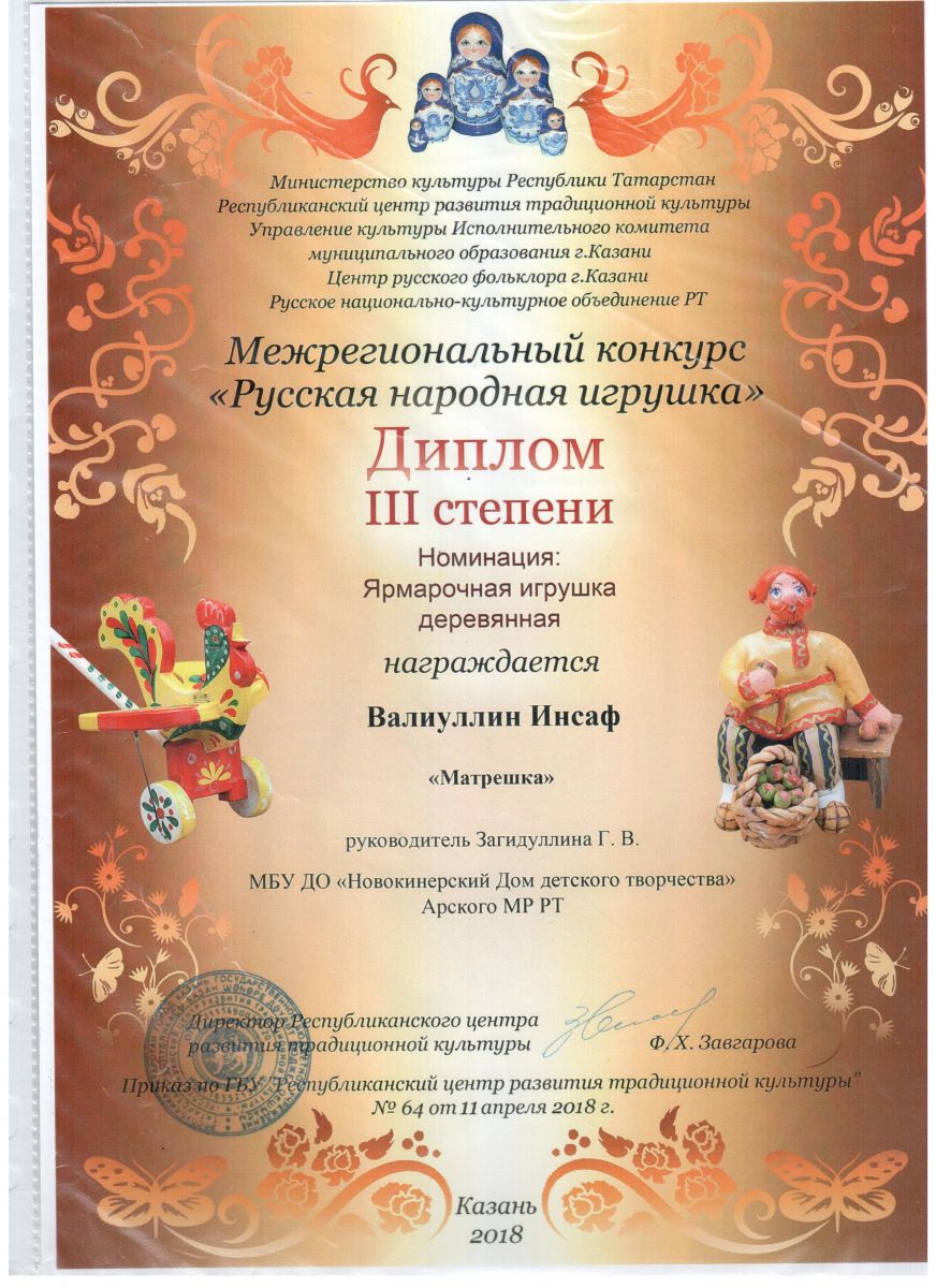 Диплом 3 степени межрегионального конкурса "Русская народная игрушка"