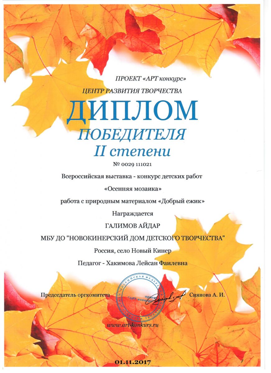 Диплом 2 степени всероссийского конкурса "Осенняя мозаика"