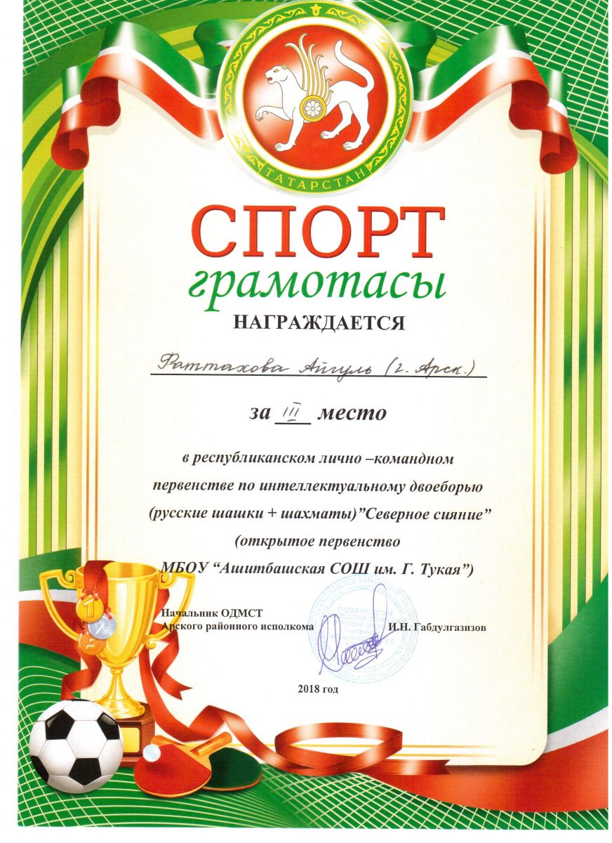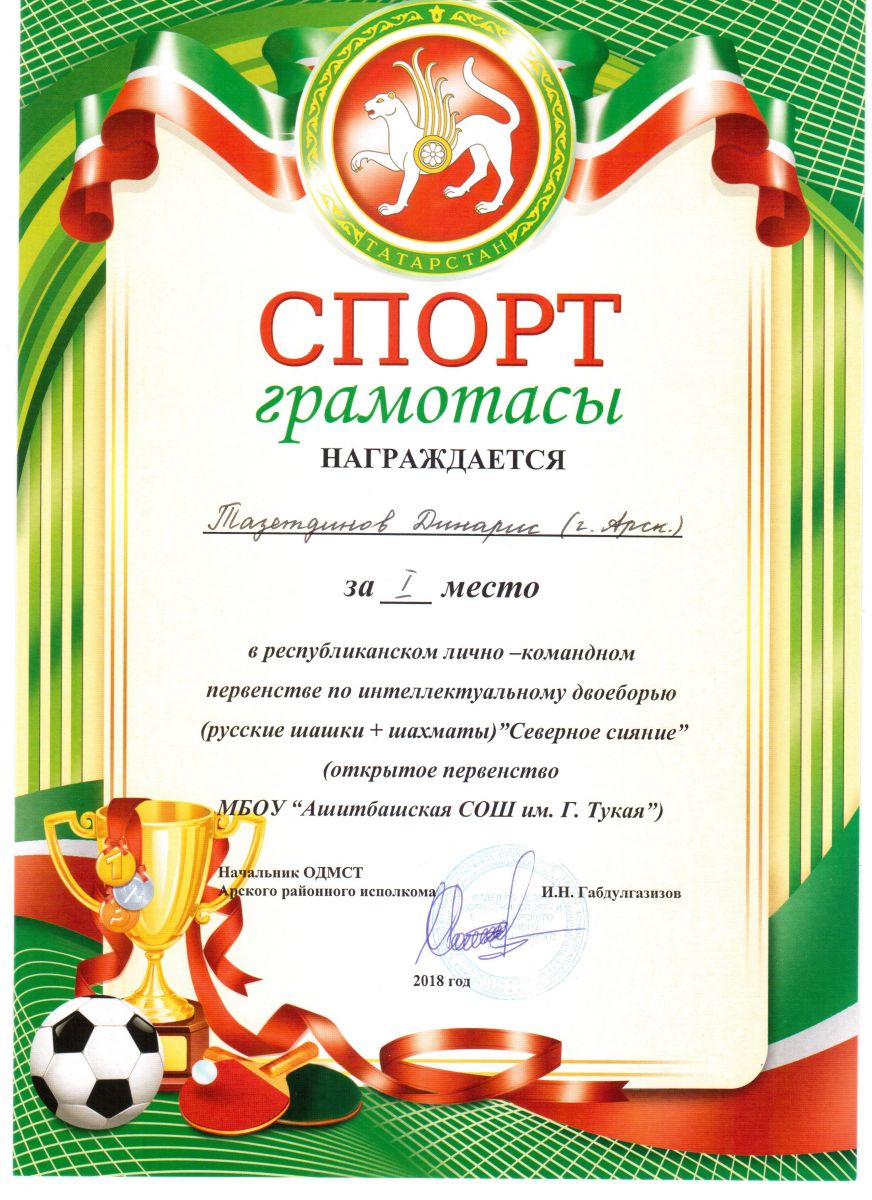 1 место в республиканском лично-командном первенстве (русские шашки+шахматы) "Северное сияние"