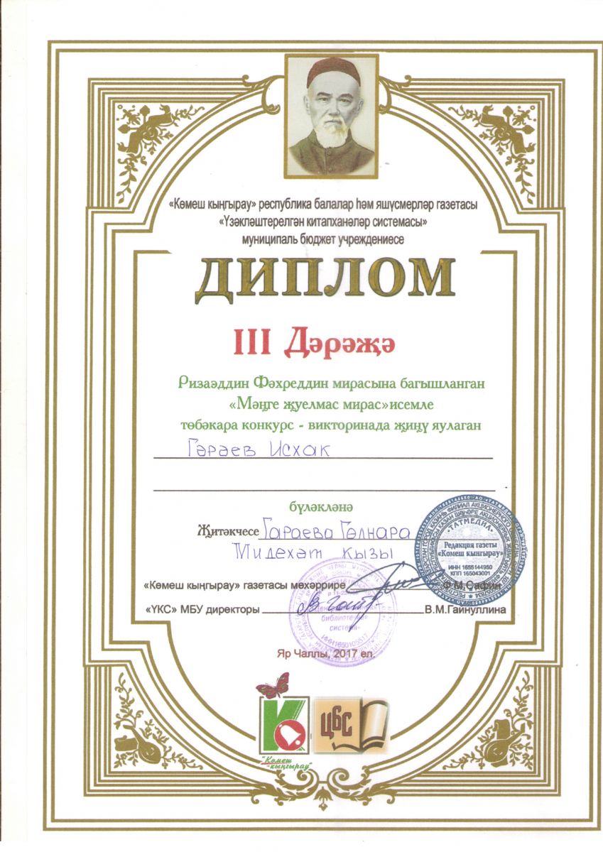 Диплом 3 степени республиканского конкурса "Милли хәзинә"