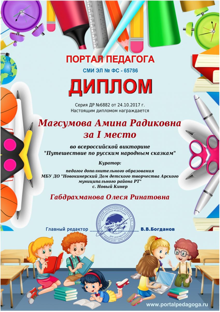 1 место во всероссийской викторине "Путешествие по русским народным сказкам"