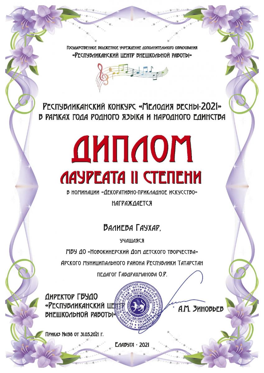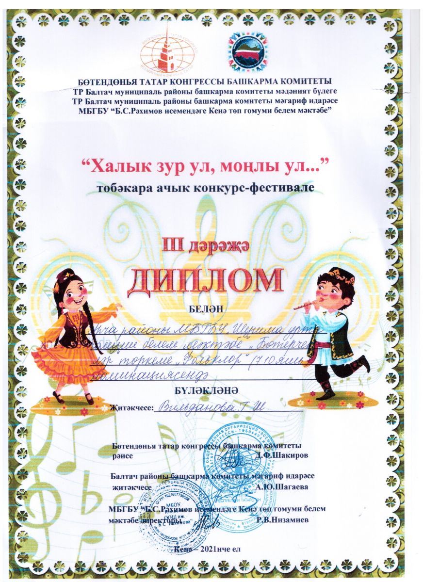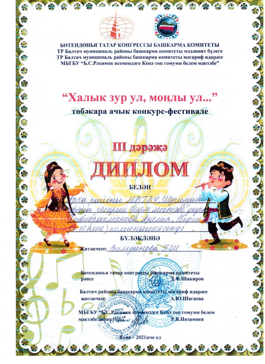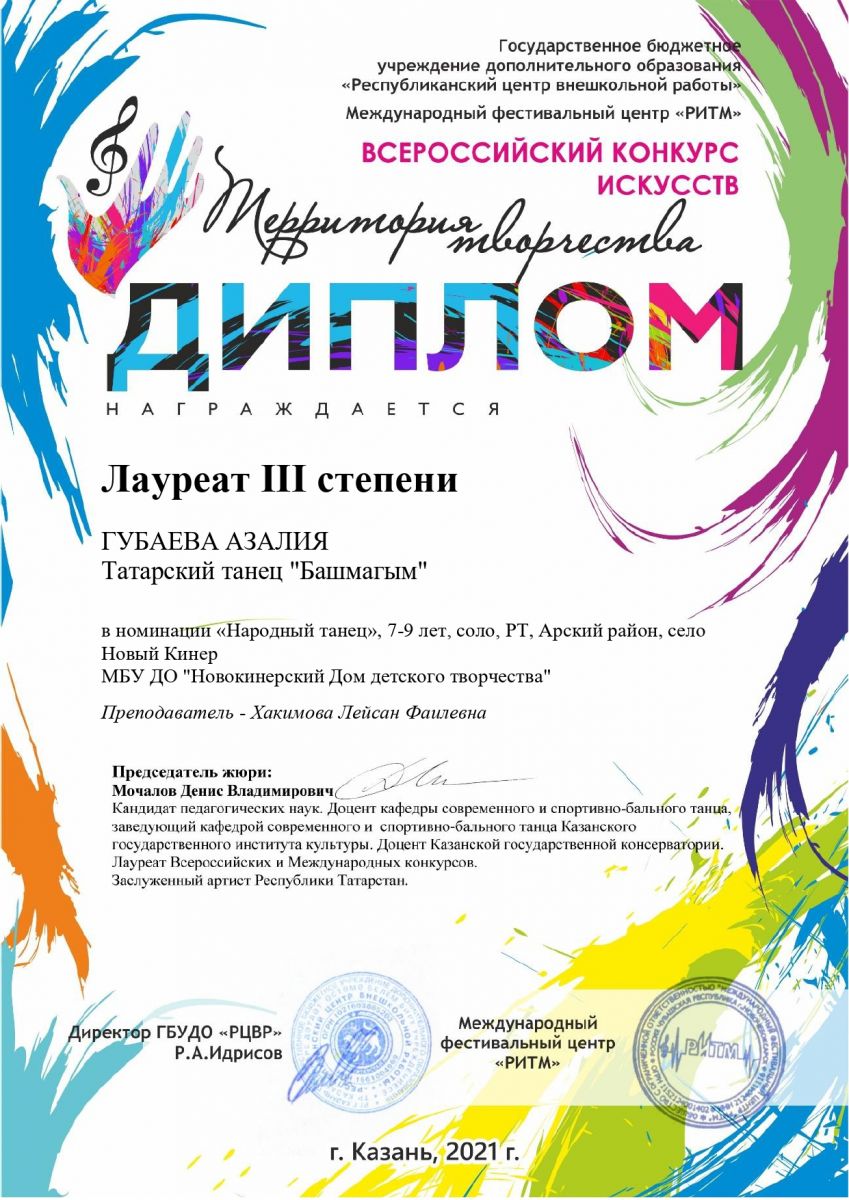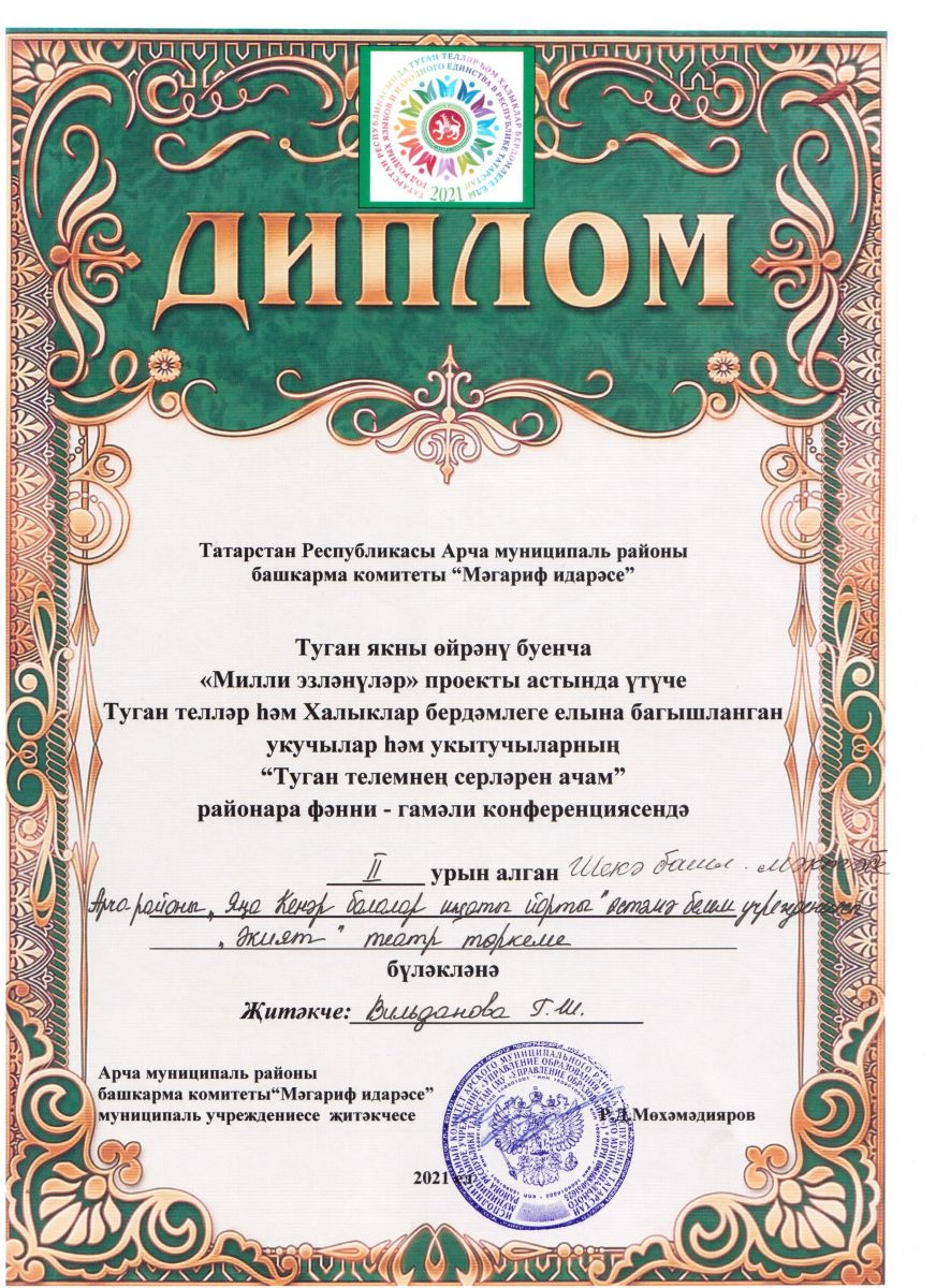 Диплом лауреата районного молодежного конкурса-фестиваля эстрадного искусства "Арча Йолдызлары 2021"