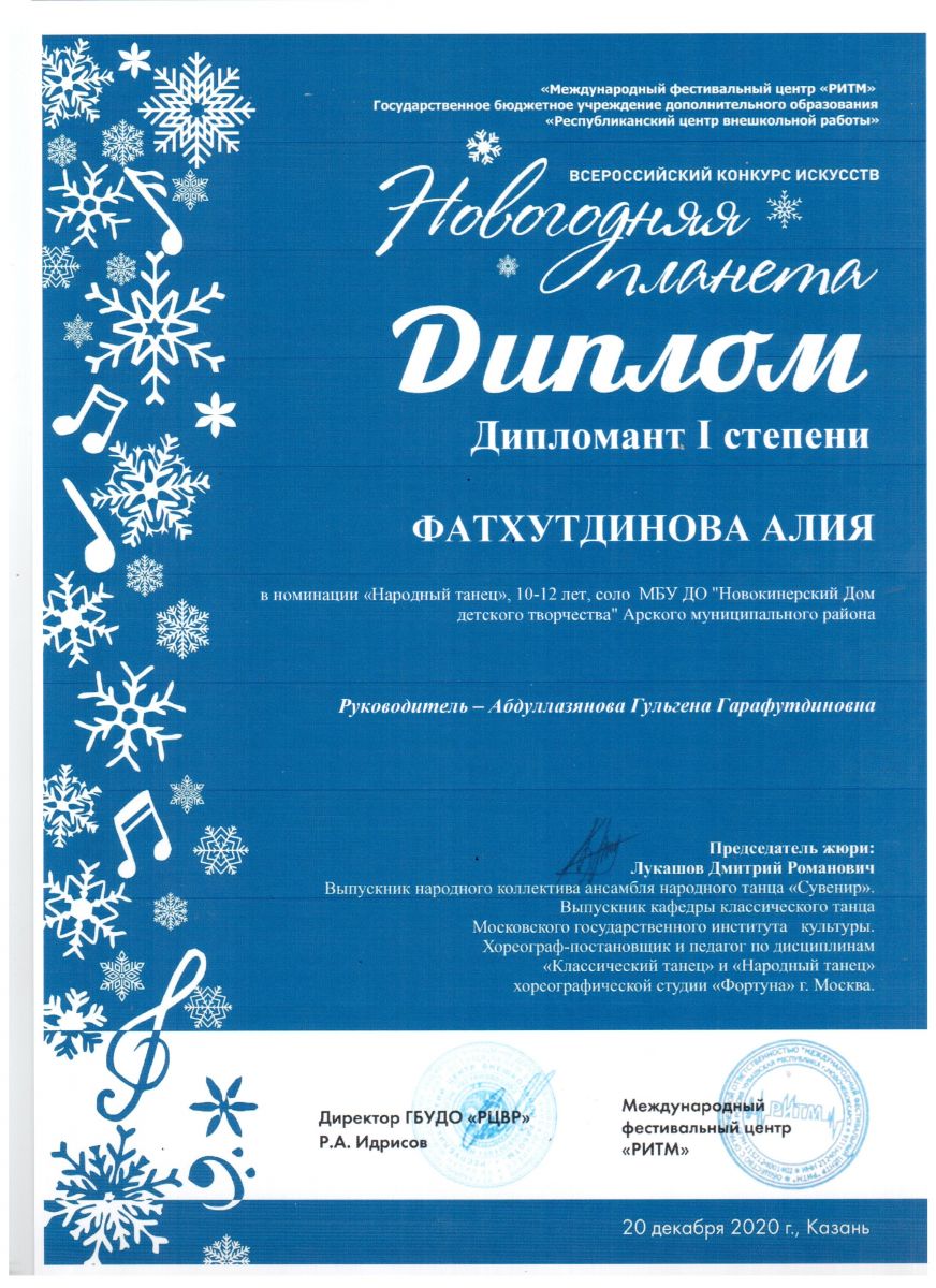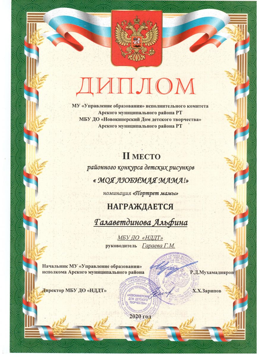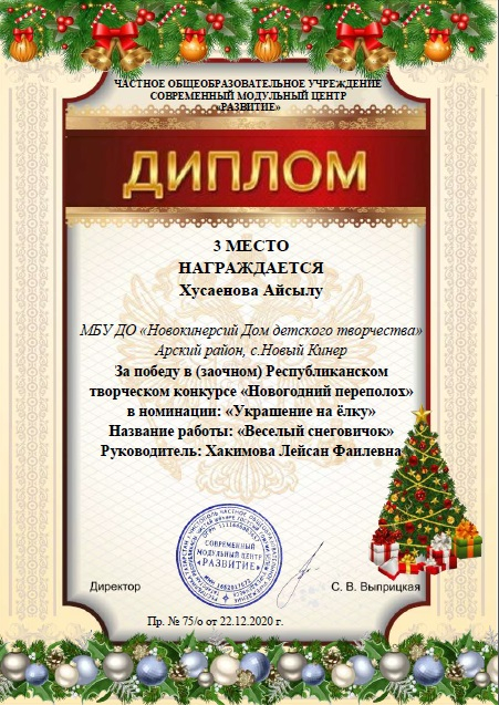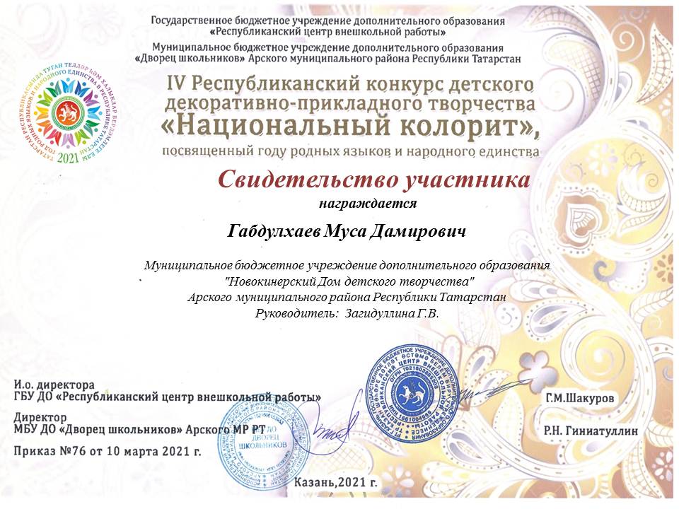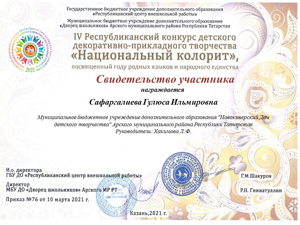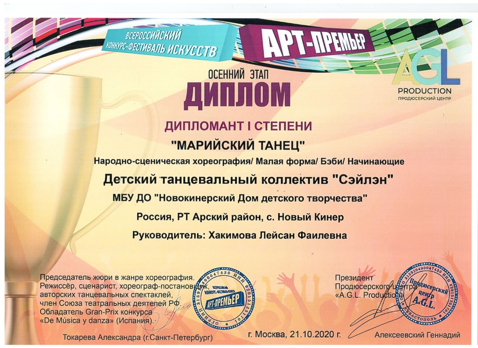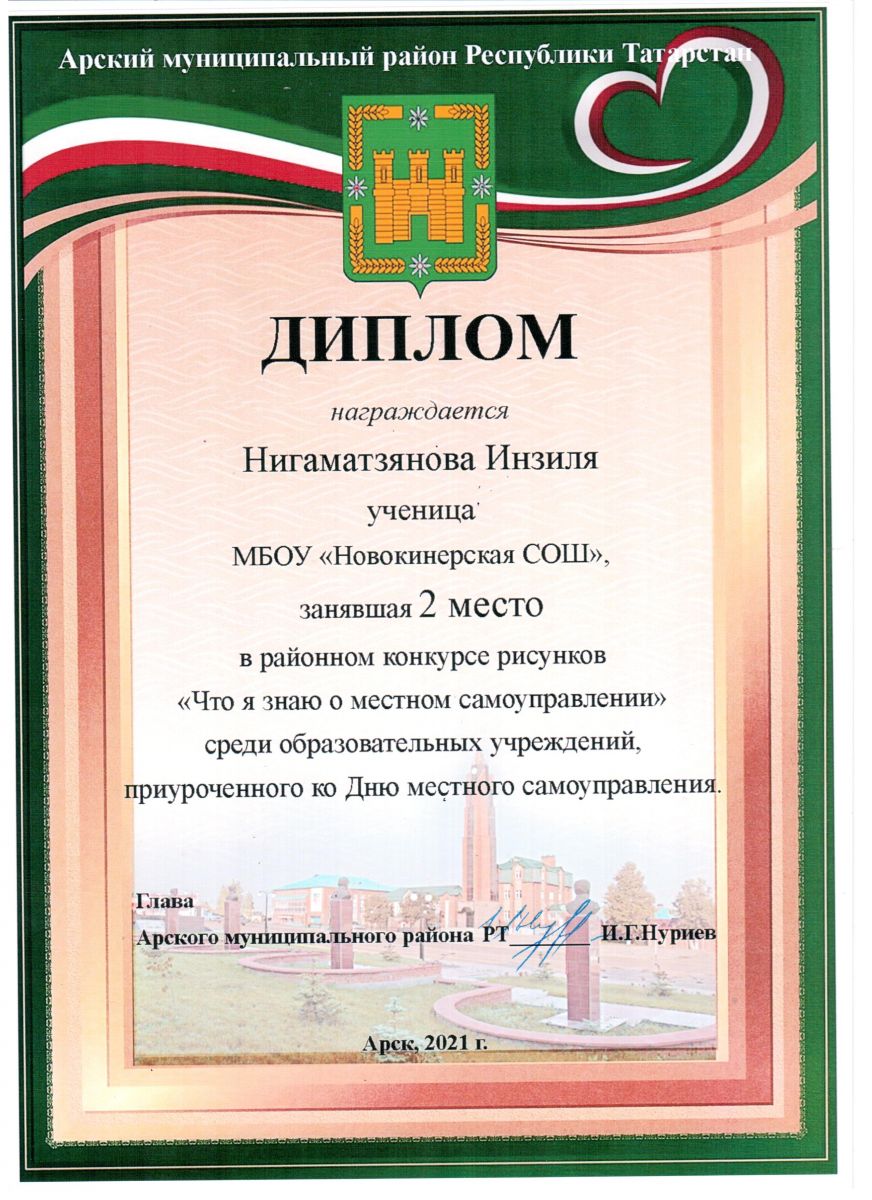 Диплом лауреата районного молодежного конкурса-фестиваля эстрадного искусства "Арча Йолдызлары 2021"