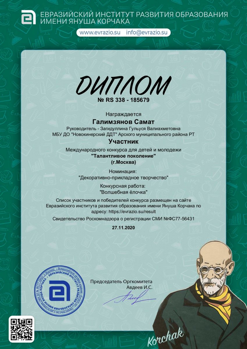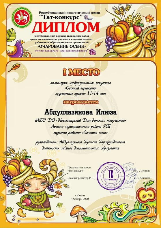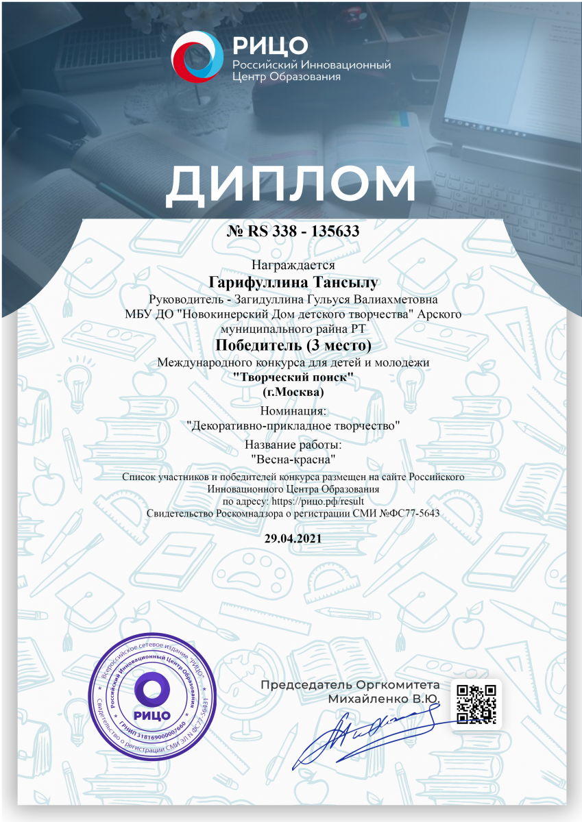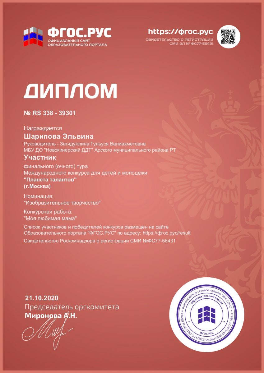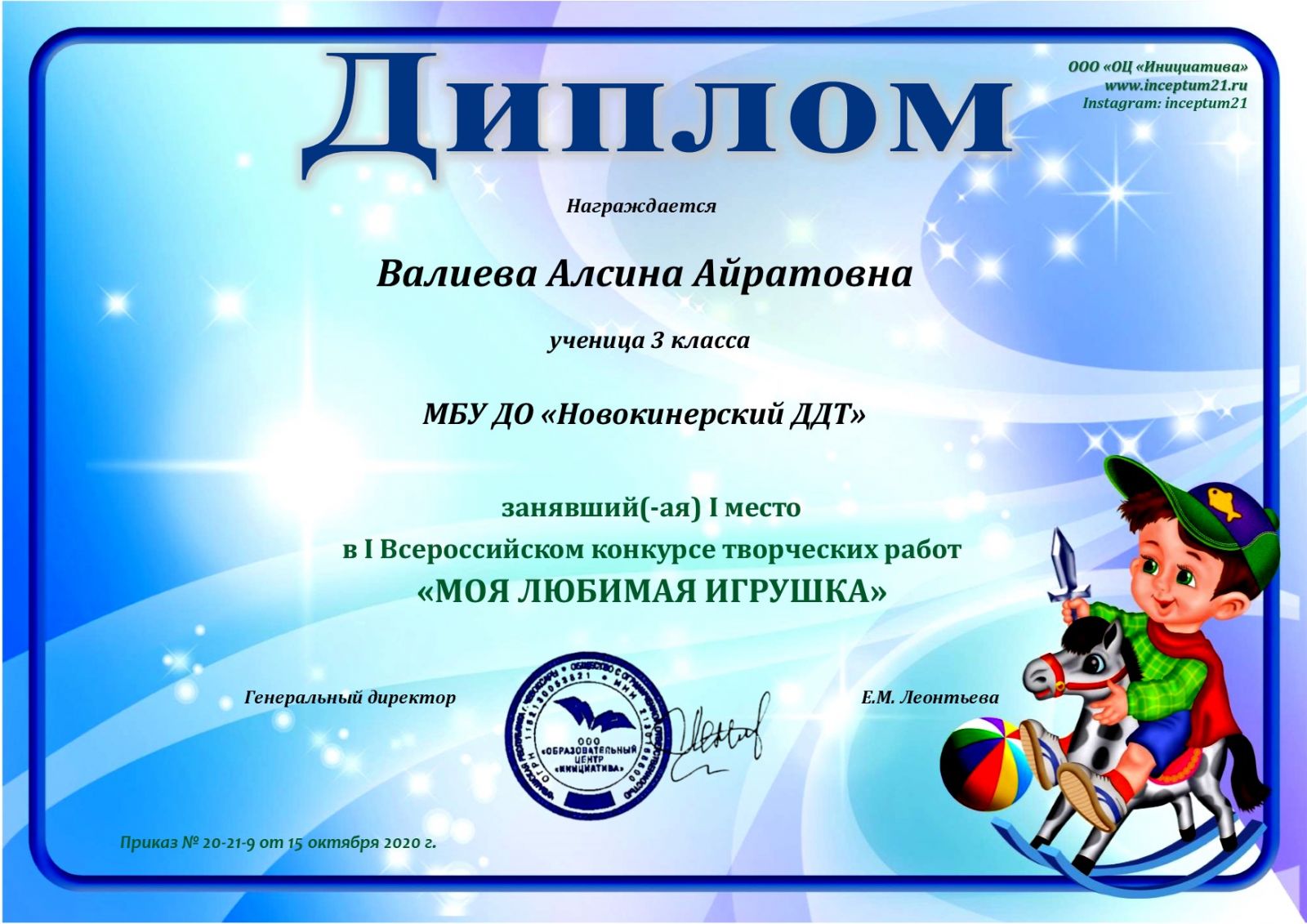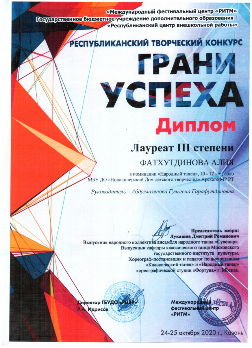 Диплом лауреата районного молодежного конкурса-фестиваля эстрадного искусства "Арча Йолдызлары 2021"
