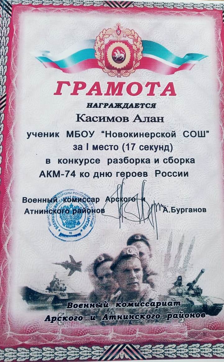 1 место - "в конкурсе разборка и сборка АКМ-74 ко дню героев России"