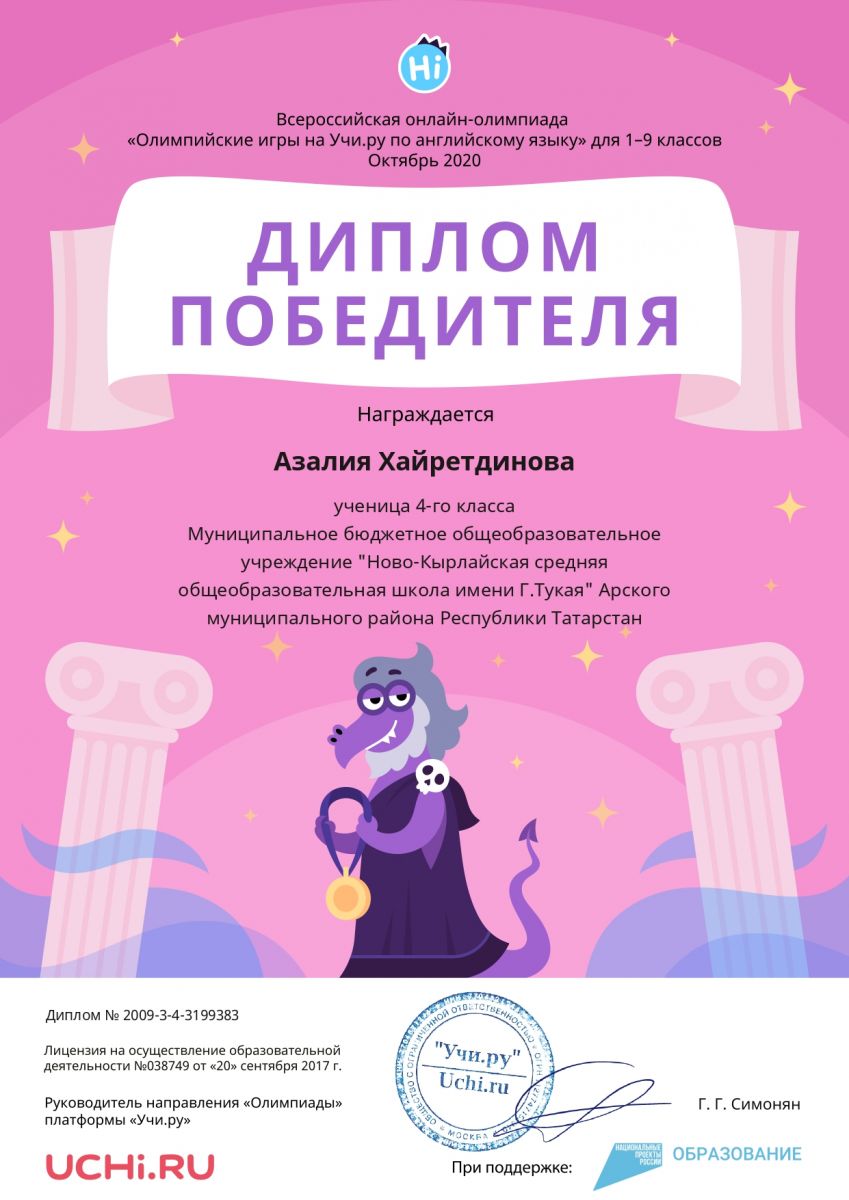 Диплом победителя - "Олимпийские игры по английскому языку"
