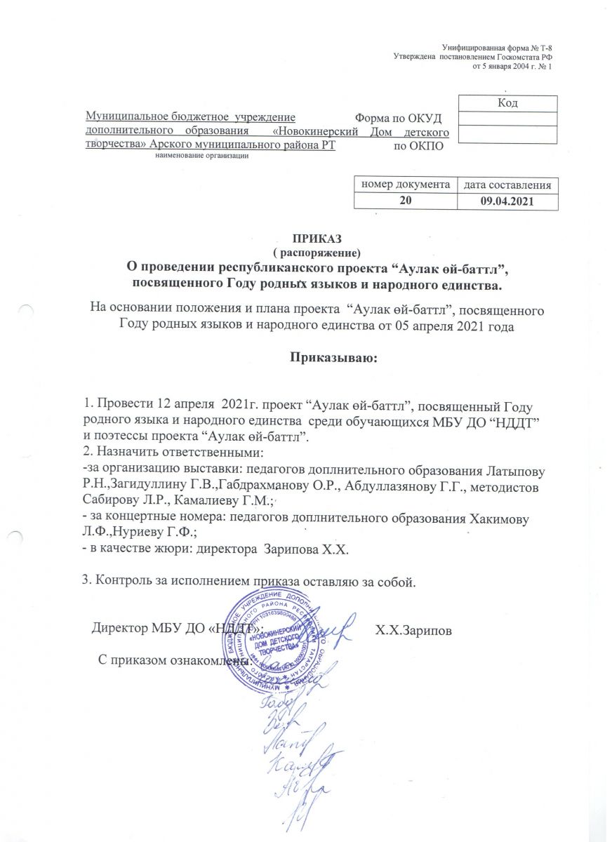 Приказ о проведении республиканского проекта "Аулак өй - баттл"