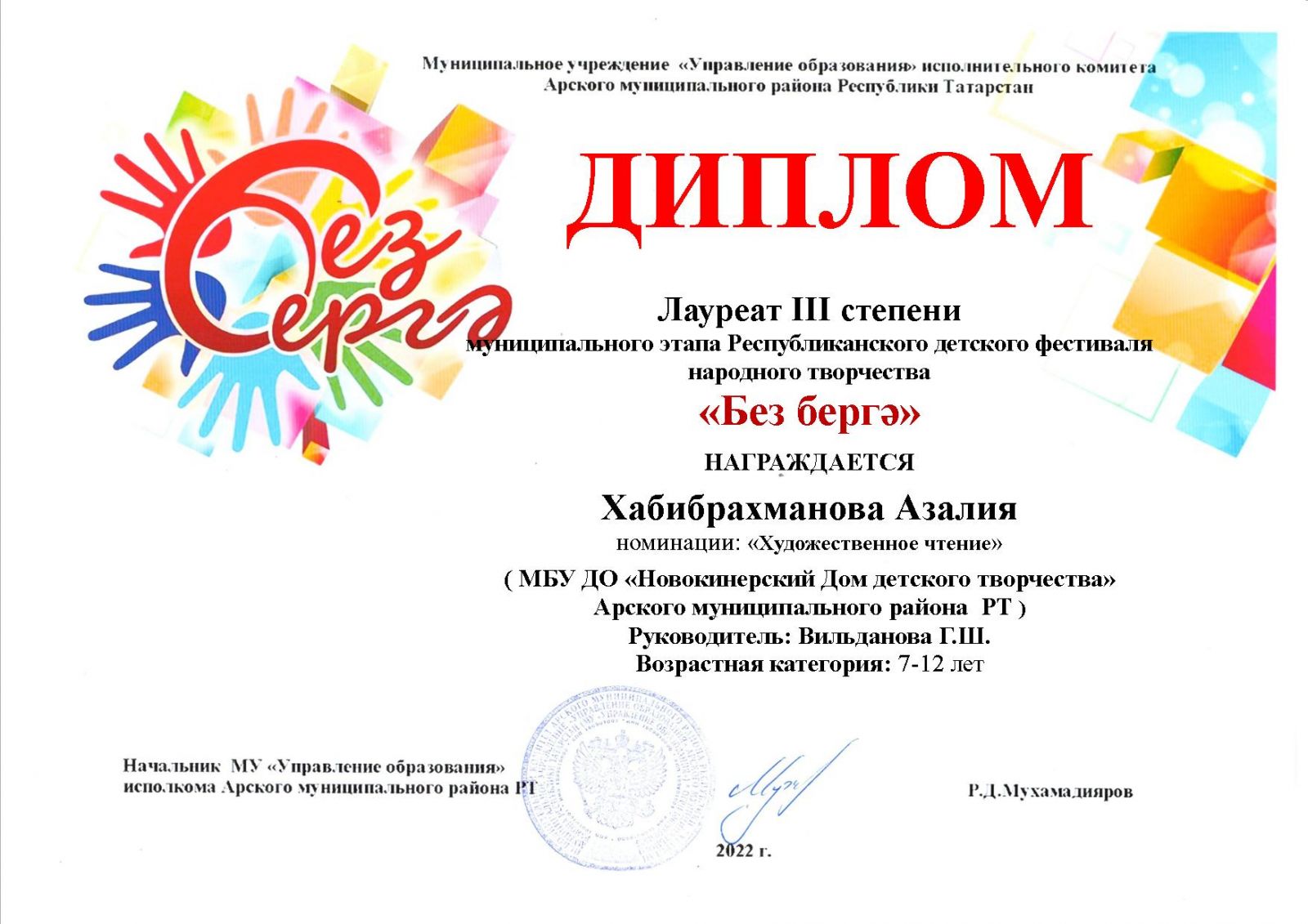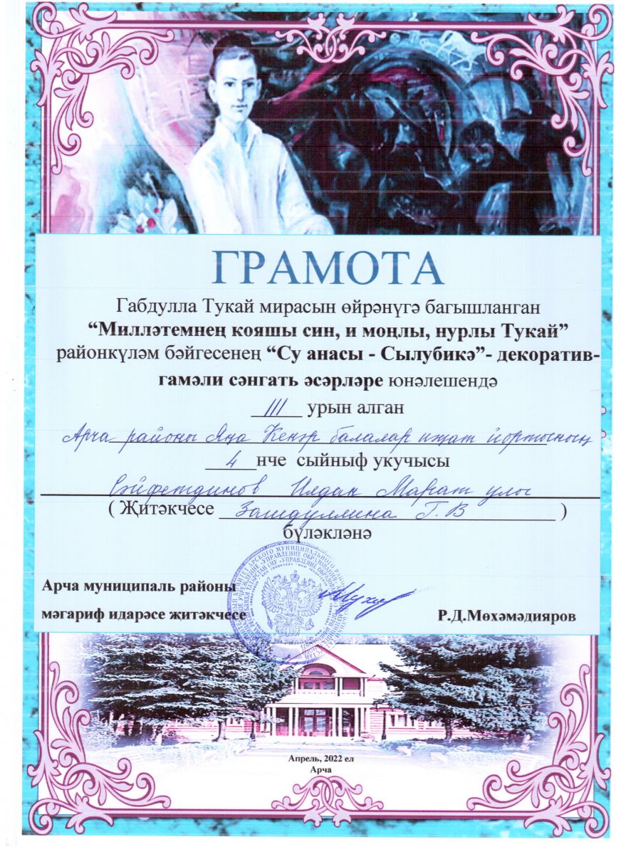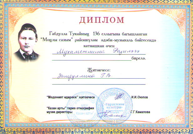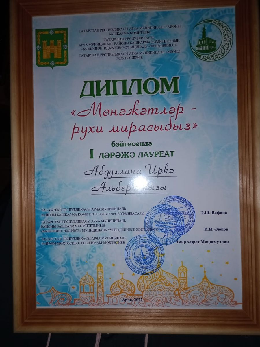 Диплом лауреата 1 степени - "Мөнәҗәтләр-рухи мирасыбыз"