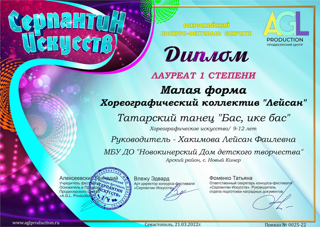 Диплом лауреата 1 степени - "Серпантин искусств" (коллектив)