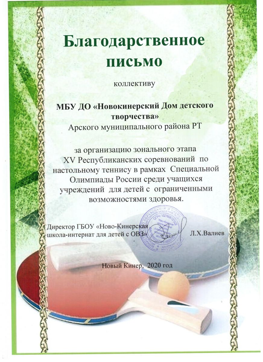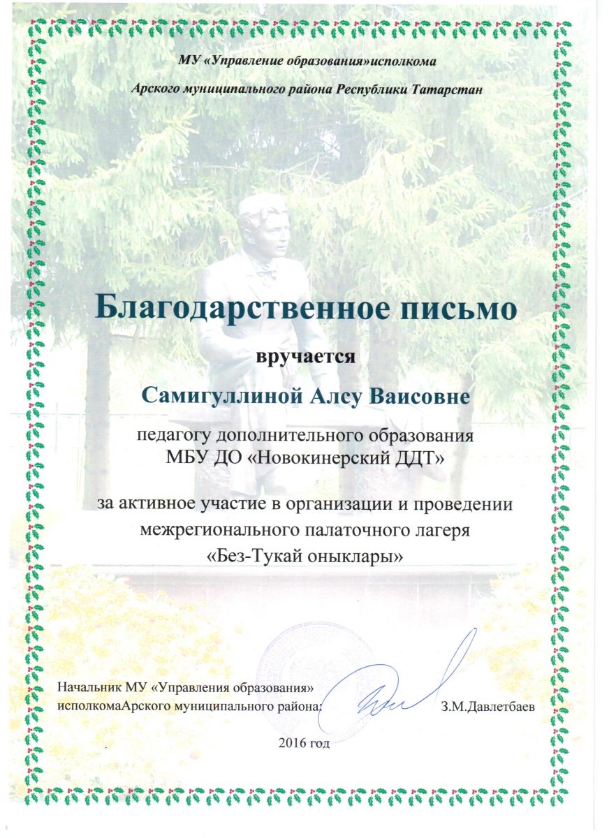 Благодарственное письмо за организацию межрегионального палаточного лагеря