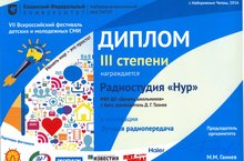 Яр Чаллы шәһәрендә VII Бөтенроссия балалар һәм яшьләр мәгълүмат чаралары фестивале узды. Әлеге фестивальдә катнашып Арча Укучылар сараеның “НУР” балалар телерадиостудиясе “Иң яхшы радиотапшыру” номинациясендә III дәрәҗәдәге диплом белән бүләкләнде. Радиостудия балаларын һәм аларның җитәкчесе Таҗиев Дамир Гилемшаеховичны зур җиңүләре белән котлыйбыз! -