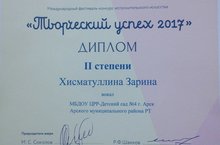 На состоявшемся 14 мая Международном фестивале-конкурсе исполнительского творчества, который проходил в Казани ,в честь нашего детского сада ( в номинациивокал-соло) защищала воспитанница средней группы № 1 Хисматуллина Зарина . Наша юная звездочка удостоилась звания дипломанта 2 степени .Пожелаем ей дальнейших творческих успехов!