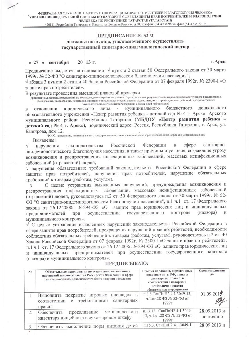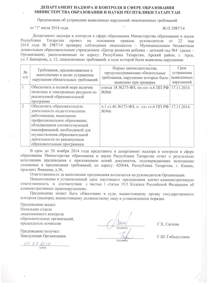 Предписания органов, осуществляющих государственный контроль в сфере образования - Мәгариф өлкәсендәге дәүләт тикшерүен үтәүче органнарның күрсәтмәләре