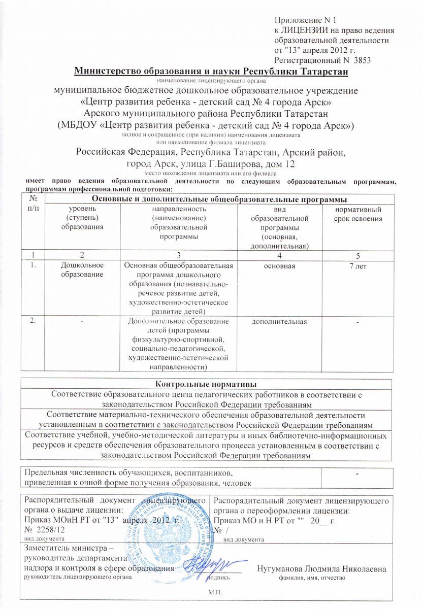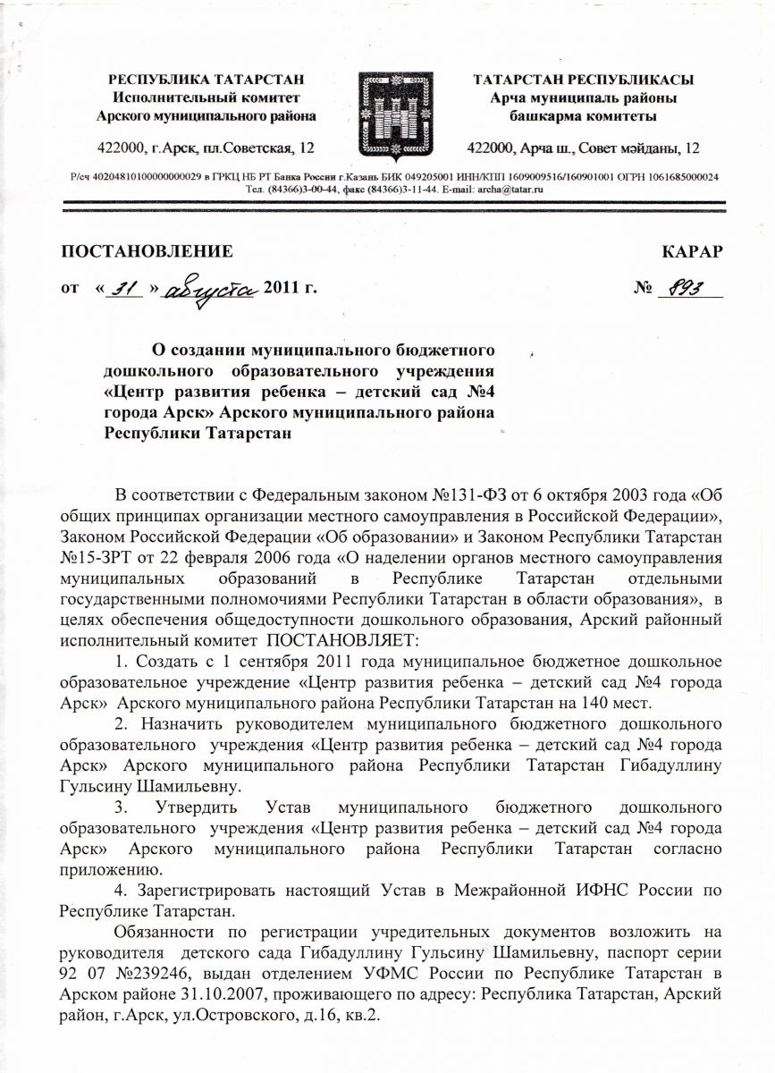 | Короткое название: | МБДОУ «Центр развития ребёнка - детский сад №4 города Арск» |