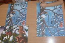 Максат: төсле кәгазьдән кышлаучы кошларны кисеп ябыштыру. Кайчы һәм клей белән сак эш итүне искә төшерү. Кошларга карата мәрхәмәтлелек, аларны сакларга һәм кешеләргә файдалары турында өйрәтү. Бәйләнешле сөйләм телен үстерү.