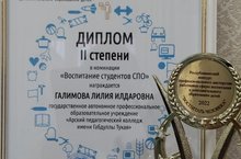 13-14 мая состоялся финал Республиканского конкурса профессионального мастерства работников сферы воспитания и дополнительного образования " Воспитать человека ". В номинации " Воспитание студентов СПО" преподаватель Галимова Лилия Илдаровна заняла 2 место. 05.07.2022