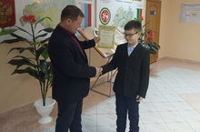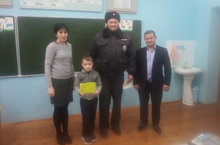 Полиция хезмәткәре Хисамиев Л.А. беренче сыйныф укучысына яктылык кайтаргыч элементлар җыелмасын бүләк итте, юлда йөрү кагыйдәләрен искә төшерде