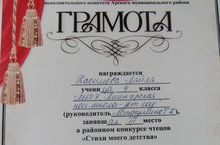 Район күләмендә үткәрелгән "Стихи моего детства" шигырь конкурсында мәктәбебездән Сәләхетдинова Н. һәм Касыймова Л. бик матур чыгыш ясадылар. Касыймова Л. 4 нче класс укучылары арасында 3 нче урынны яулады. Кызларыбызны җиңүләре белән котлыйбыз!