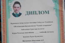 16.01.2016 Татар халкының бөек шагыйре, татар әдәбияты классигы, әдәби тәнкыйтьче, публицист, яңа заман татар әдәбиятына һәм әдәби теленә нигез салучы Габдулла Тукайның 130 еллыгына багышланган “Тукай эзләреннән” бәйгесендә Гран-при яулаган укучыбыз Каюмов Рүзәл Диплом белән бүләкләнде.