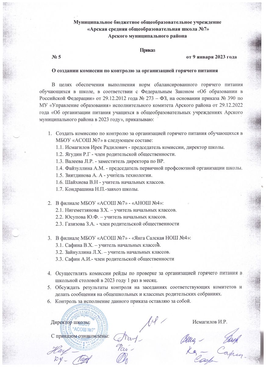 - на основании Постановления исполнительного комитета Арского муниципального района РТ от 03.12.2021 года № 2209 для семей, имеющих в своем составе 4 и более детей, детей-сирот и детей, оставшихся без попечения родителей, детей с ограниченными возможностями здоровья, организовать бесплатное горячее питание за счет республиканской субсидии в размере 38 руб. 30 коп. за счет средств местного бюджета.