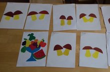 Уртанчылар группасы: Тема: "Гөмбәләр"Максат: Икегә бөкләнгән кәгазь битеннән бердәй ике кисәк кисү алымы белән таныштыру.Почмакларны салмак түгәрәкләп кисү алымын ныгыту.Мәктәпкә әзерлек группасы: Тема:"Җиләк-җимешләр салынган ваза" Максат:Җиләк -җимешләр турында белемнәрен ныгыту,икегә,дүрткә бөкләнгән кәгазьдән бердәй фигуралар кисәргә өйрәнүне дәвам итү.