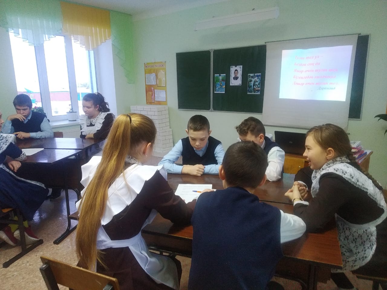 Бүген укучылар туган телнең байлыгын,матурлыгын күрә белергә өйрәтү максатыннан үткәрелгән тәрбия дәресендә катнаштылар. Укучылар туган тел турында җырлар җырладылар,шигырьләр сөйләделәр,күренекле шәхесләрнең тел турында әйткән сүзләрен, мәкальләрне искә төшерделәр..