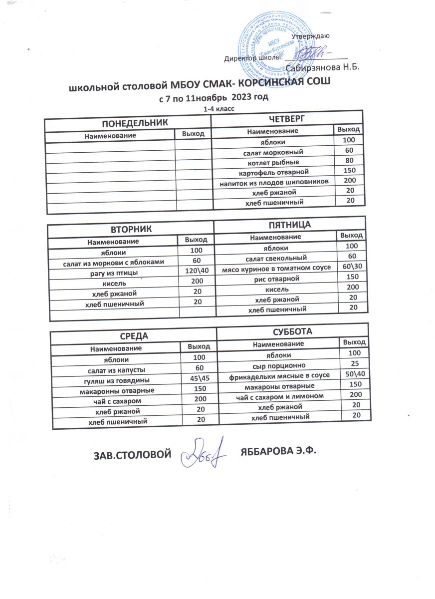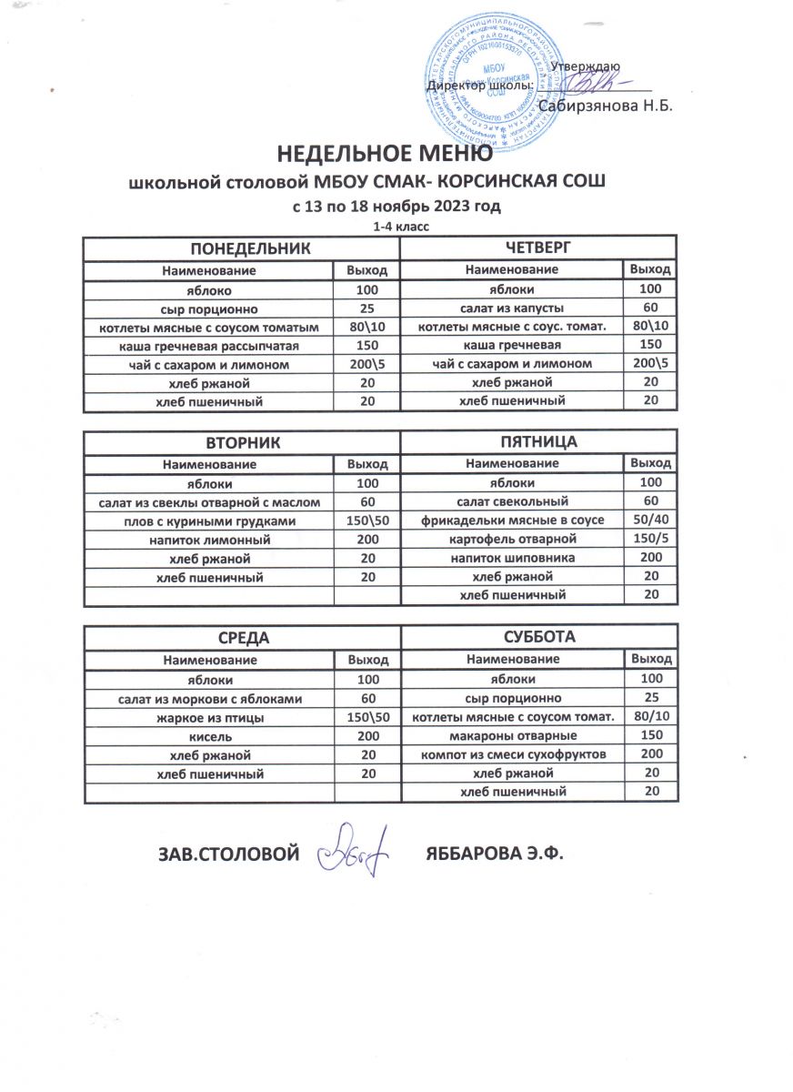 Меню на13 ноября-18 ноября 2023 года для 1-4 классов