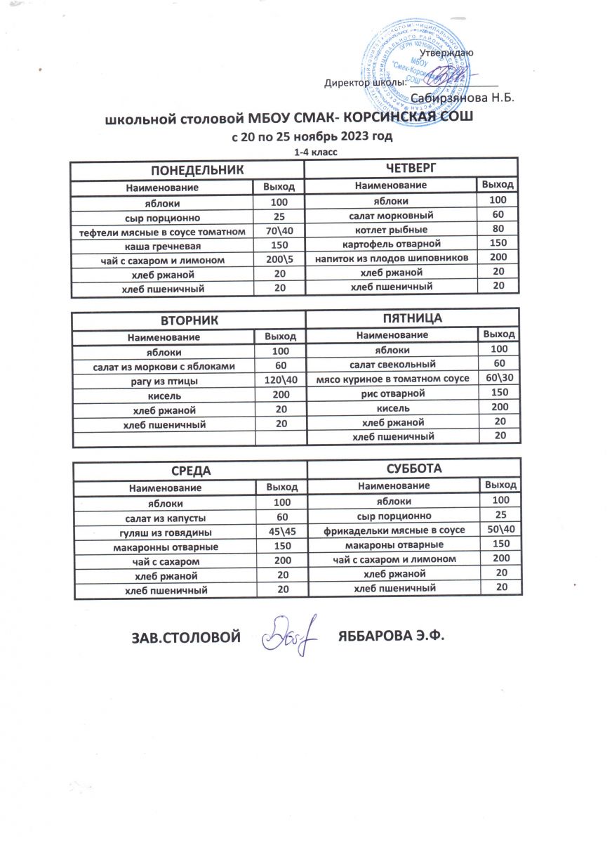 Меню на 20 ноября-25 ноября 2023 года для 1-4 классов