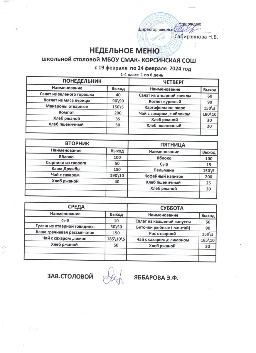 Меню на 19 февраля - 26 февраля 2024 года для 1- 4классов