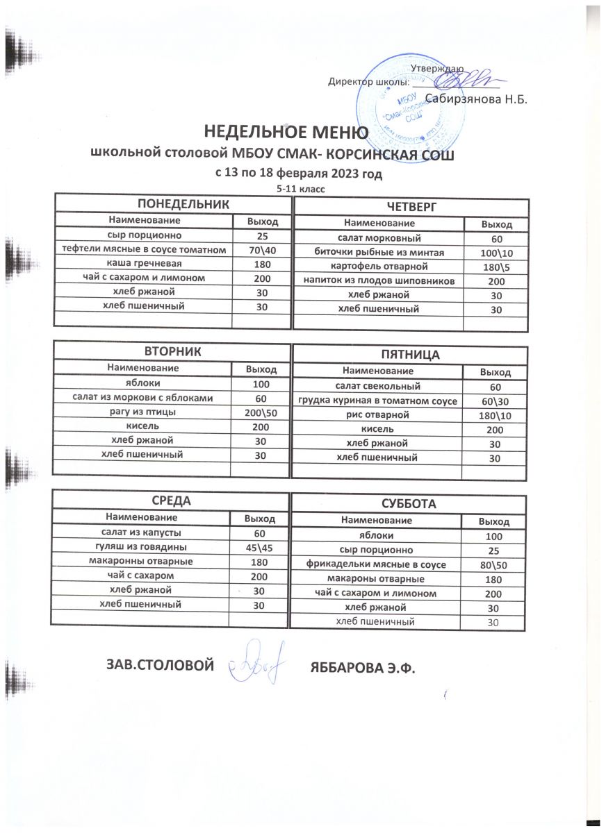 Меню на 13 февраля - 18 февраля 2023 года для 5 - 11 классов
