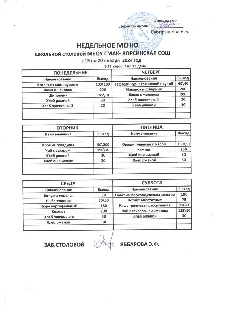 Меню на 15 января - 20 января 2024 года для 5 - 11 классов