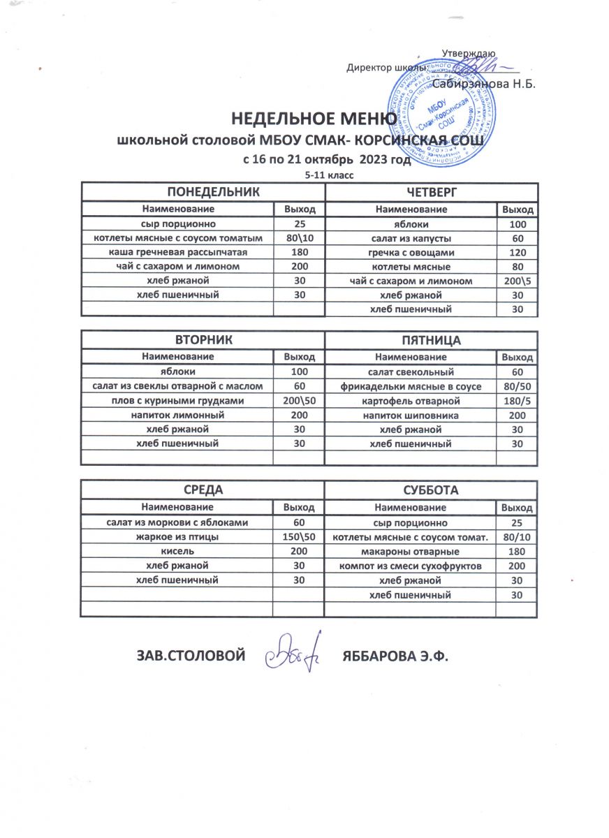 Меню на 16 октября - 21 октября 2023 года для 5-11классов