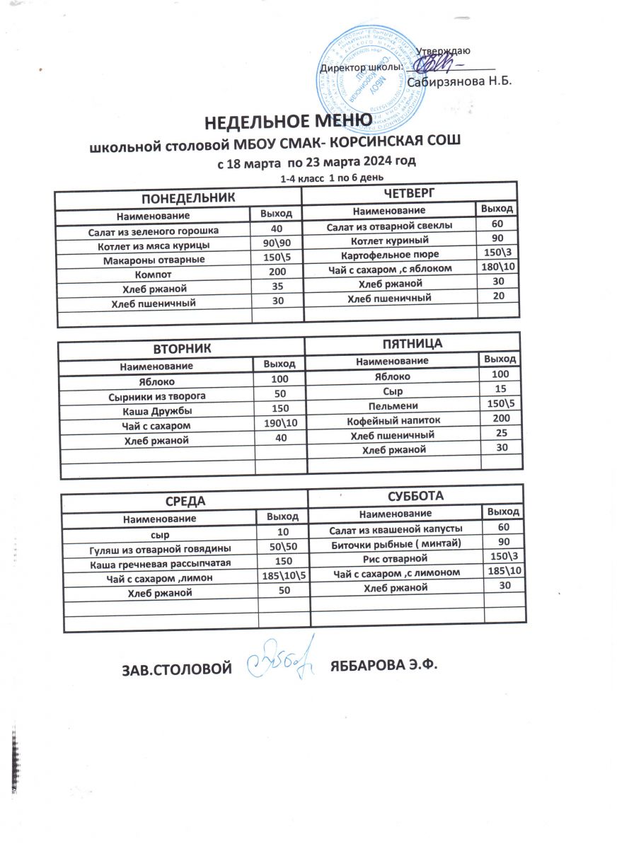 Меню на 20 марта - 24 марта 2023 года для 1 - 4 классов