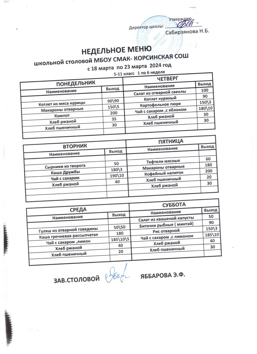 Меню на 4 марта - 9 марта 2024 года для 5- 11классов