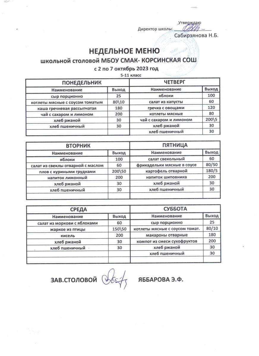 Меню на 2 октября - 7 октября 2023 года для 5-11 классов