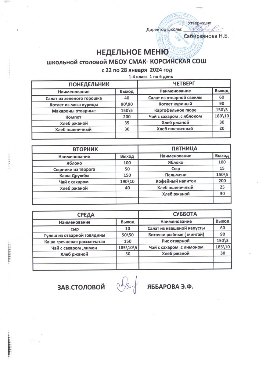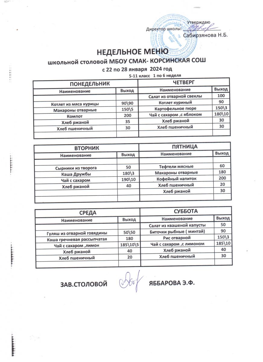 Меню на 22 января -29 января 2024 года для 5-11 классов