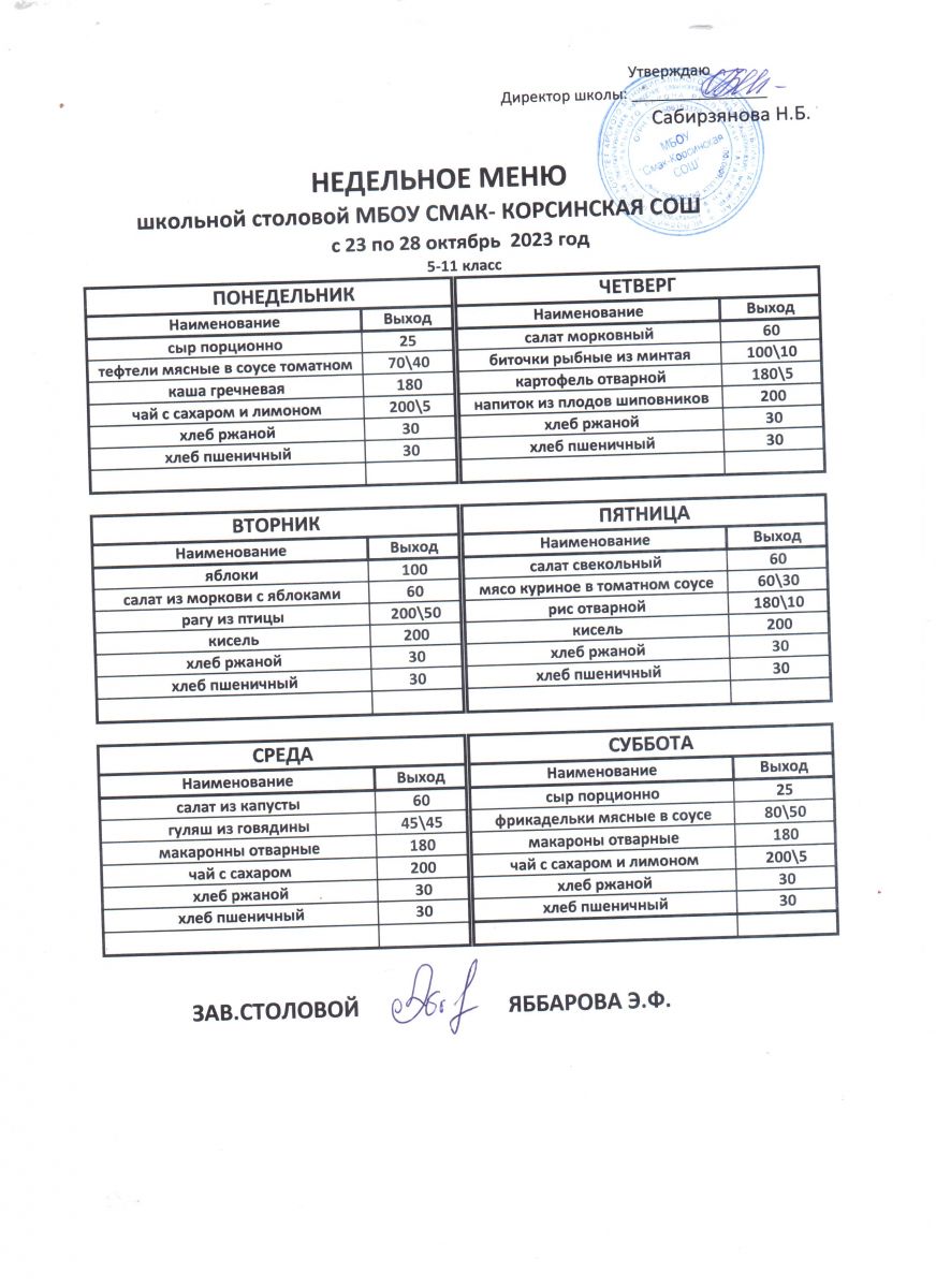 Меню на 23 октября - 28 октября 2023 года для 5-11 классов