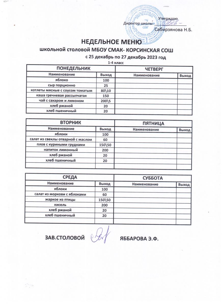 Меню на 25 декабря - 27 декабря 2023 года для 1-4 классов