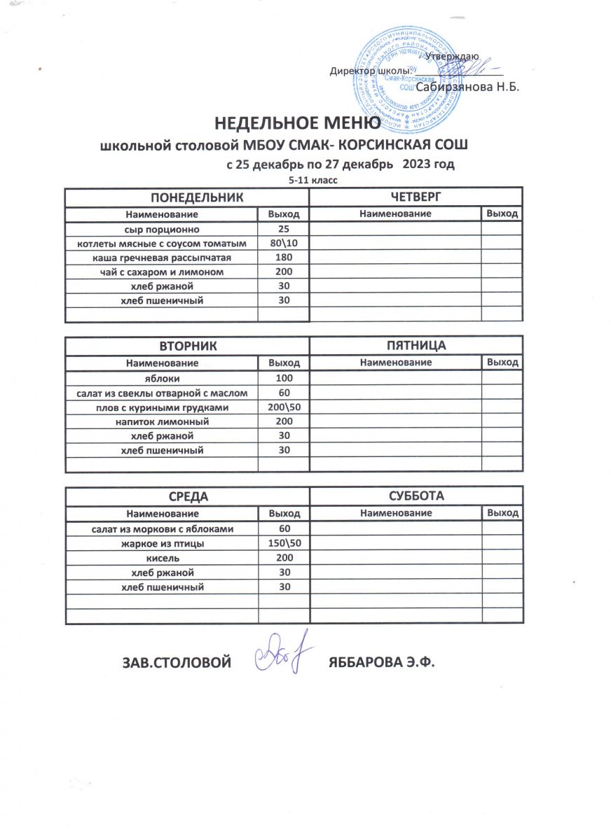 Меню на 25 декабря - 27декабря 2023 года для 5-11 классов