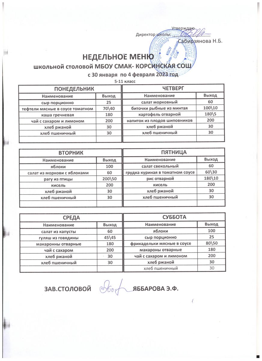 Меню на 30 января - 4 февраля 2023 года для 5 - 11 классов