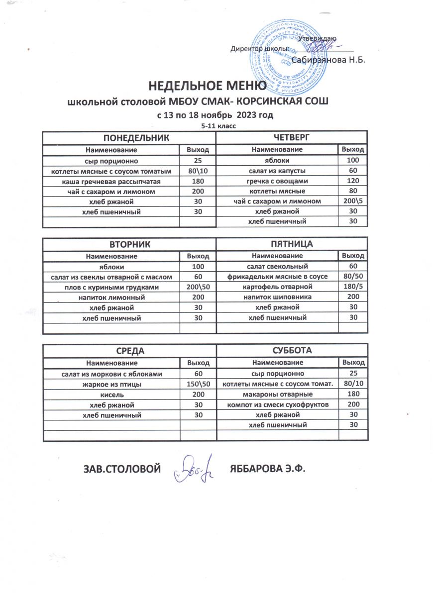 Меню на 13 ноября-18 ноября 2023 года для5-11 классов